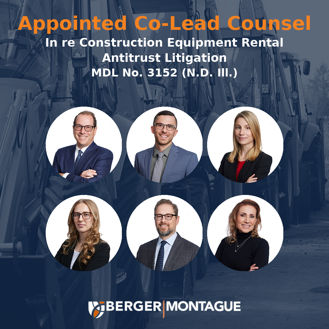 On October 10, 2025, the Honorable Sara L. Ellis of the U.S. District Court for the Northern District of Illinois appointed Berger Montague PC as Co-Lead Counsel, along with DiCello Levitt LLP, in In re Construction Equipment Rental Antitrust Litigation, MDL No. 3152 (N.D. Ill.). Judge Ellis also appointed a […]